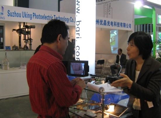 此次展会,北玻院的展台设计简洁而不失大气,稳重而不失时尚。展出的产品不仅有氟化钡晶体、氟化钙晶体、石英/保偏光纤及光纤跳线、冷光源、滤光片等传统强势产品,新型细径内窥镜、光纤温度传感器以及小管道探伤机器人等新产品也在本次展会上亮相,吸引了众多商家及专业人士驻足交流。